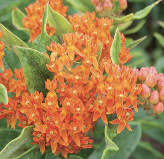 Perennial, 12-24” tall, orange flower clusters, attracts butterflies and bees, known as butterfly weed or milkweed.