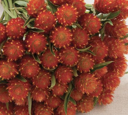 Also known as globe amaranth, deep orange/red color, 1.5" blooms, dries well