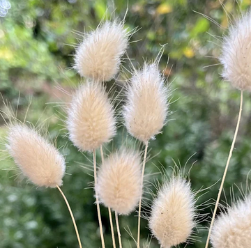 Ornamental grass with small puffy white flowers at tips of blades.