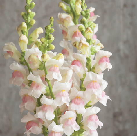 White blooms dusted with pink, warm season annual snapdragon, 32-48" tall