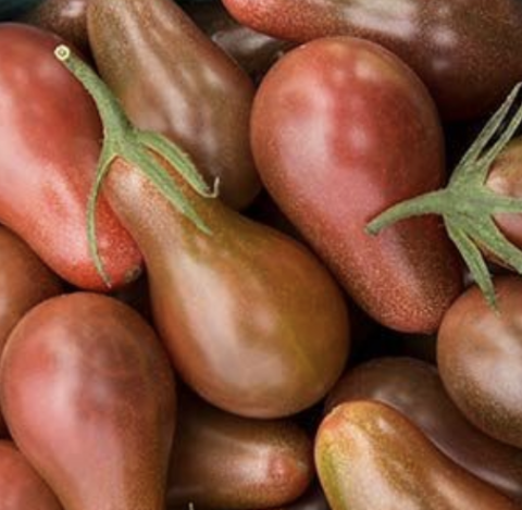 Cherry Tomato, dark pink grape-shaped, 1" long, good yield and sweet, Indeterminate.