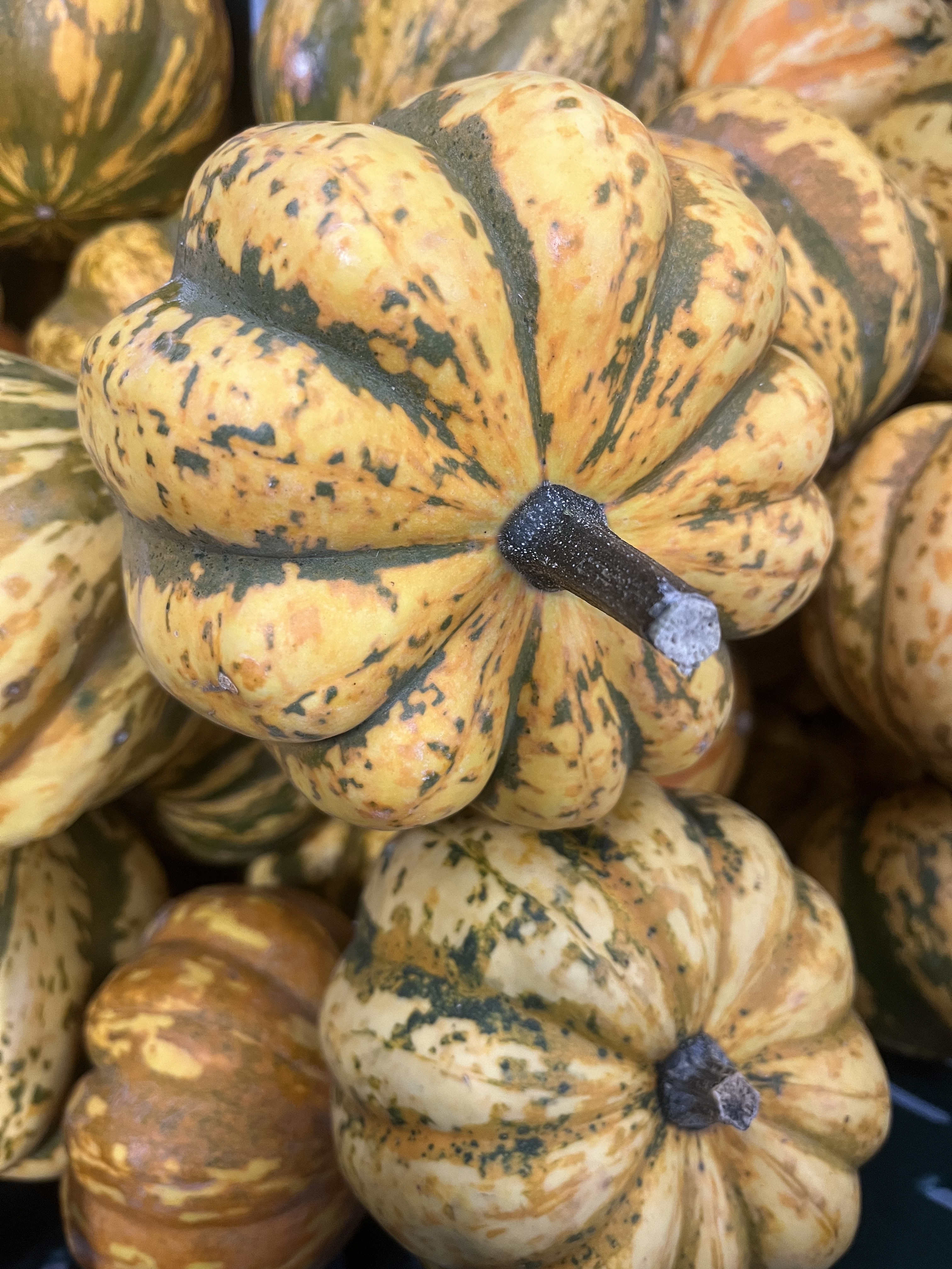 Acorn squash with yellow base, green stripes, and a speckled appearance.