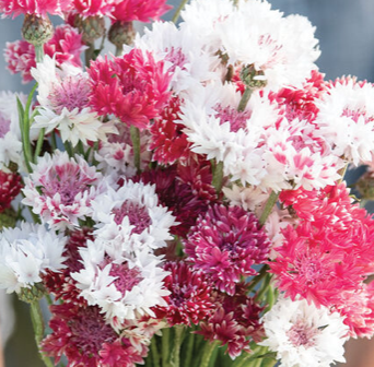 Abundant 1–1 1/2" flowers on upright plants. Double and semidouble, bicolor blooms in pink and white.