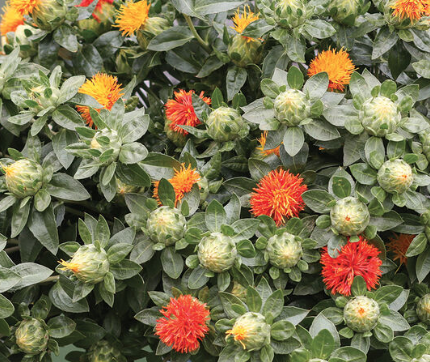 Tufted thistle-like flowers with oval leaves. Fiery orange-and-gold petals are edible and sometimes used as a substitute for saffron. Also known as safflower