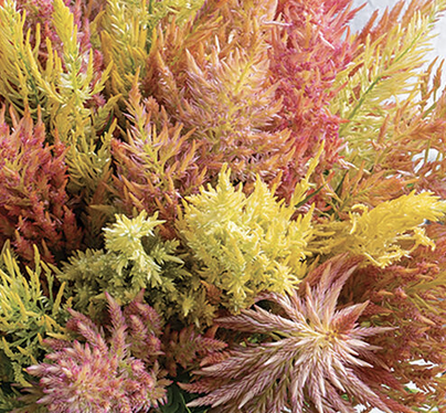 Annual, 4 pack of celosia, peach, gold, lime, pink feathery spikes 4-8"