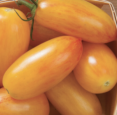 Bright yellow elongated snacking tomato with red marbling at blossom end