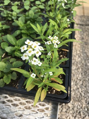 Perennial, sprawling mounds of white flowers 12" tall, spreads to 18" or more, attracts beneficials