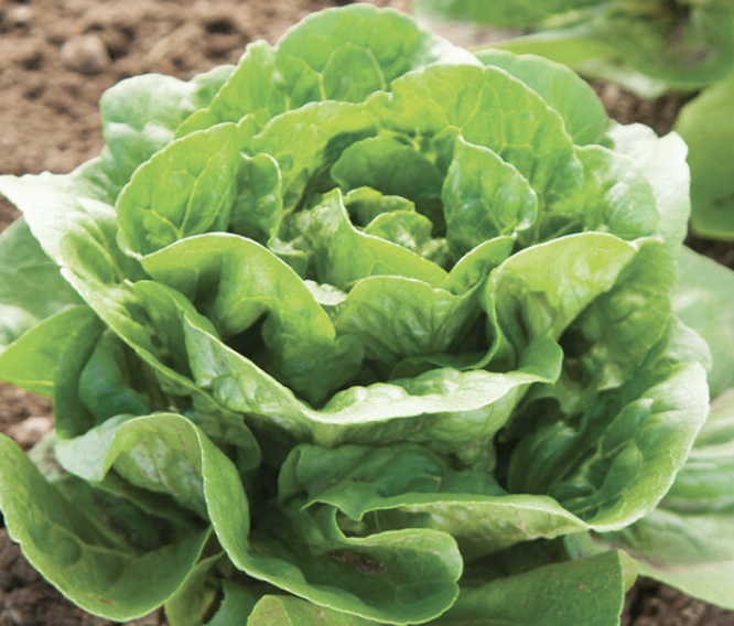 Green mini romaine lettuce heads, matures in 43 days, sold as 4 pack of transplants.