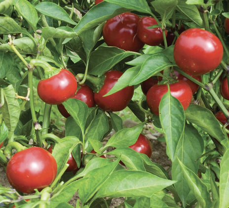 Red, round fruits 1.5" diameter perfect for stuffing, 2 out of 5 on heat.