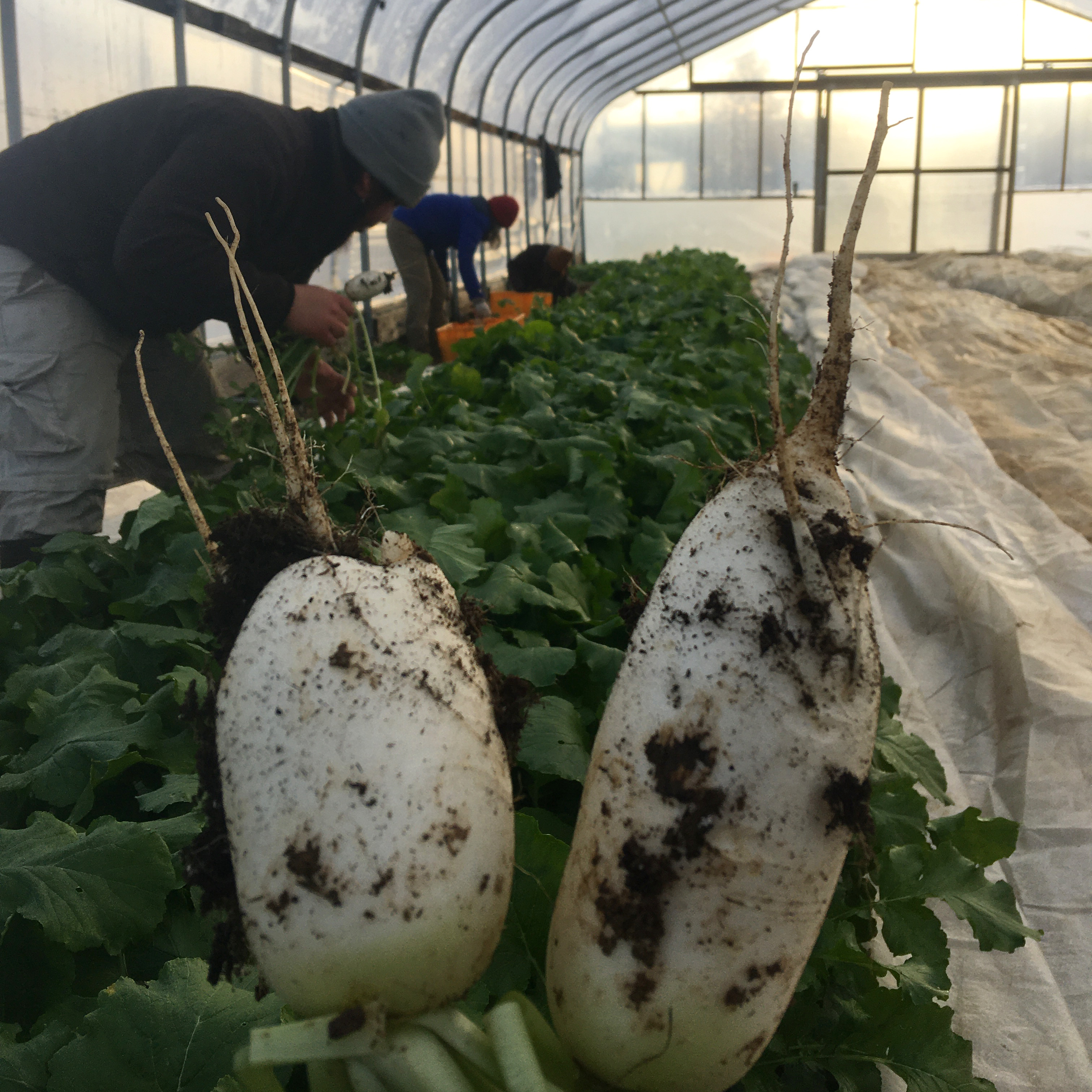 Winter radish, white alpine, are a mini daikon, very sweet, sold per pound with roots only